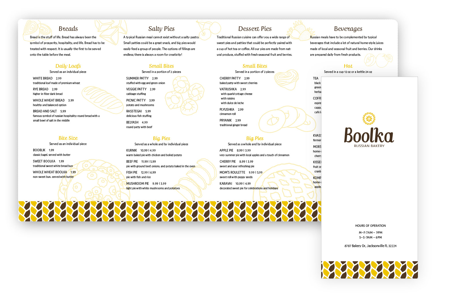 Boolka is a Russian bakery mostly for people who are not familiar with Russian cuisine. Here, people would discover traditional Russian pies, pastry, and desserts. The brand represents warm and welcoming Russian culture.